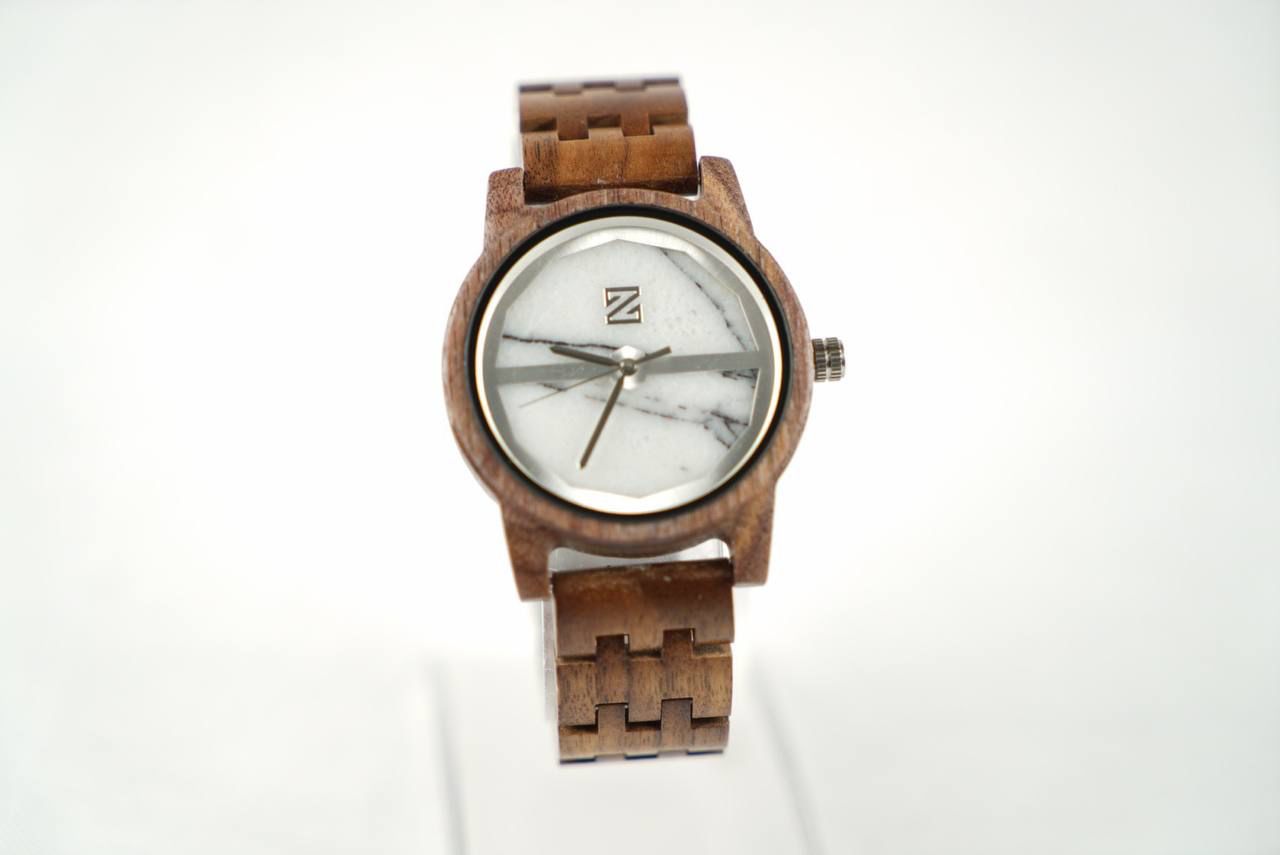 ZEBRİNO White-Marble , beyaz mermer kadranı ile benzersizdir, hiçbir saat aynı mermer desene sahip değildir . Hem kasa hem de kordon tamamen doğal ceviz ağacından yapılmıştır.